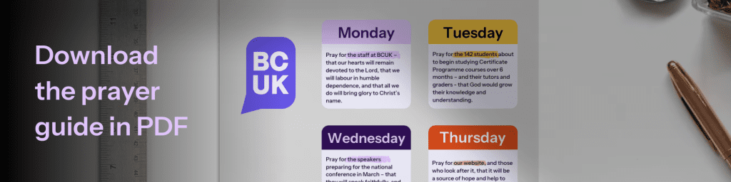 And, if you are willing, we would love you to join with us for a week of prayer. Each day bringing an aspect of the work of BCUK to the Lord. You can click the image below to download a copy of the prayer guide for the whole of next week, or follow us on social media for daily prompts: